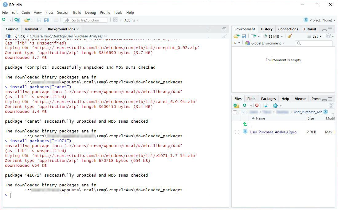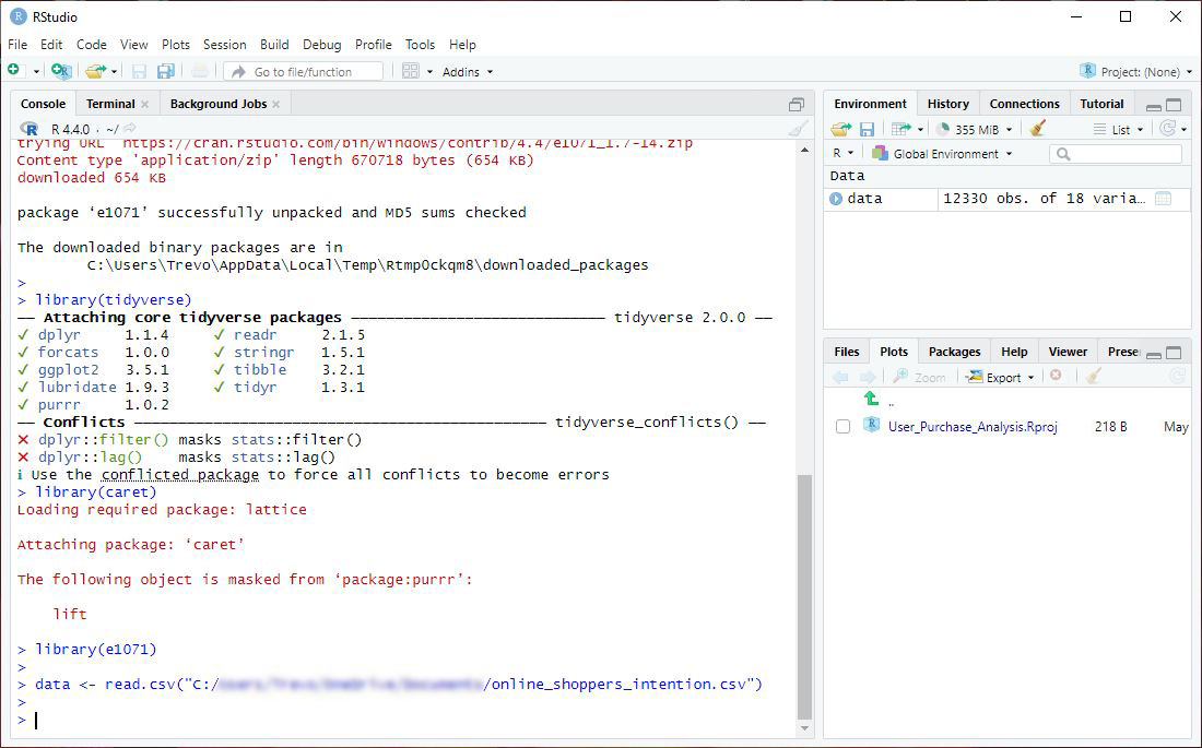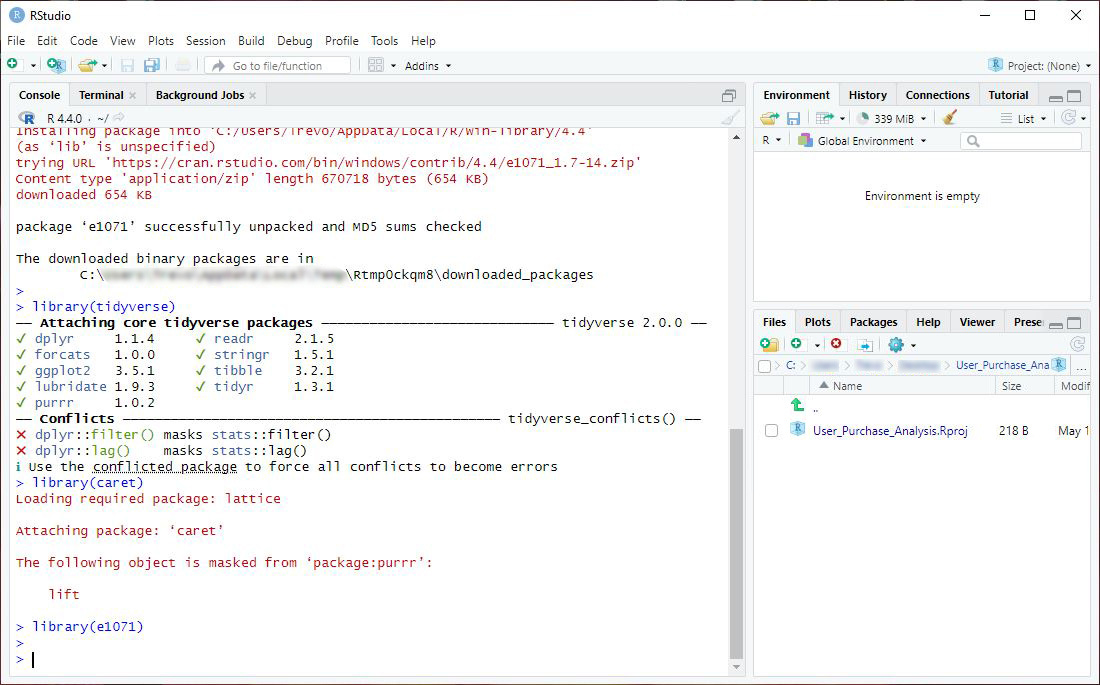 library(e1071)✏️ NOTE: Disregard the Conflicts section shown in the Console.
