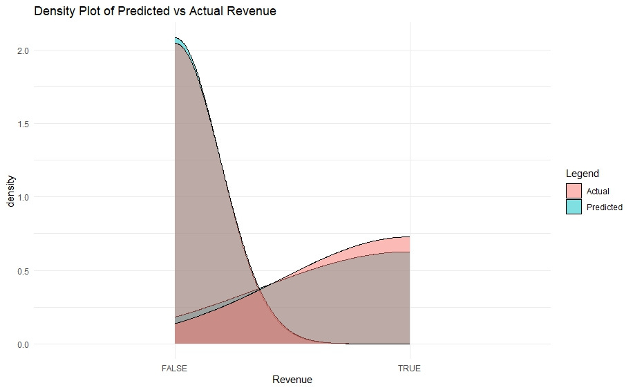 labs(title = "Density Plot of Predicted vs Actual Revenue", x = "Revenue", fill = "Legend") +