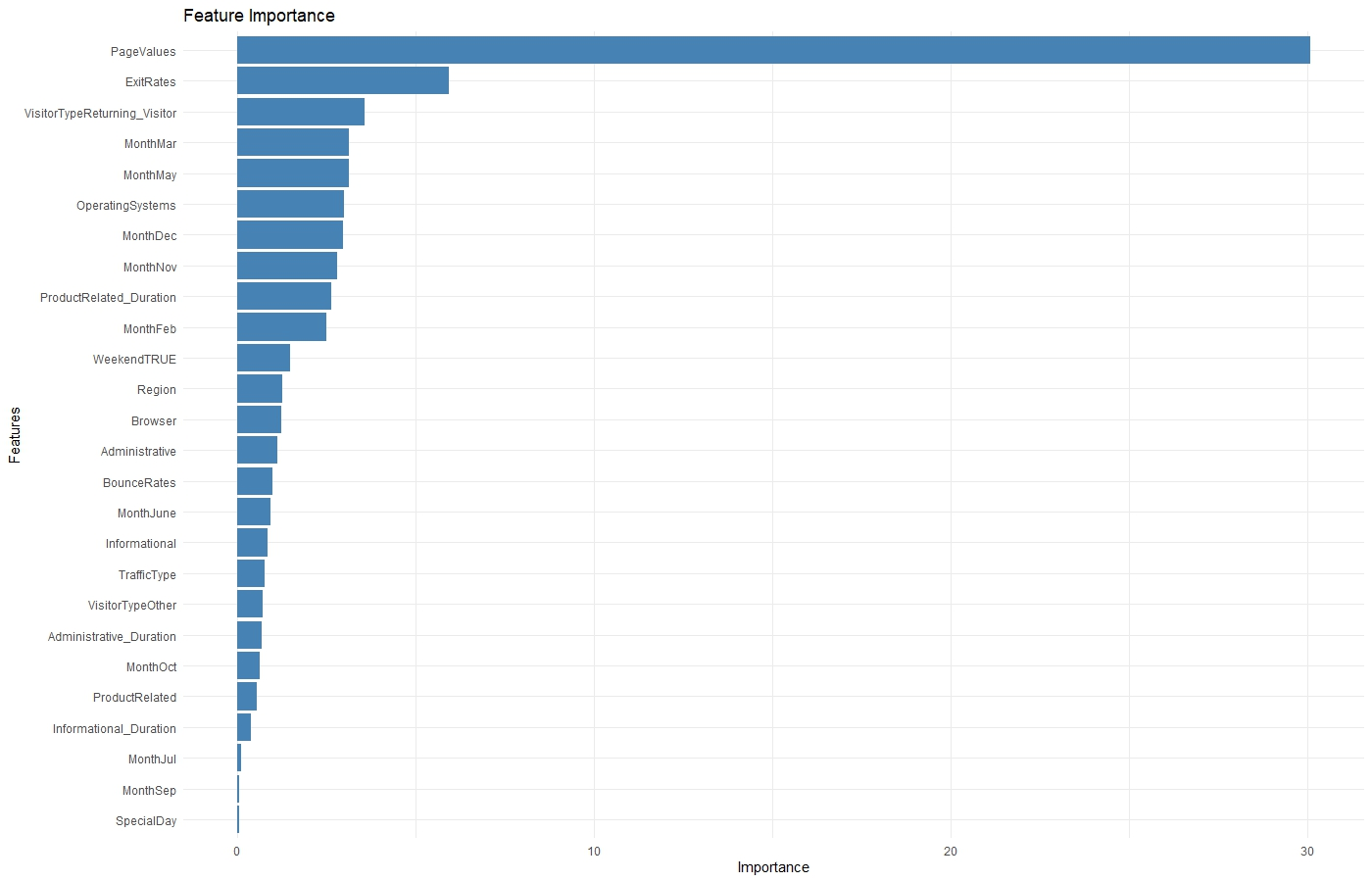 The PageValues feature has the highest importance, meaning it has the biggest impact on the model's predictions. The MonthJul, MonthSep, and SpecialDay features had the least importance.